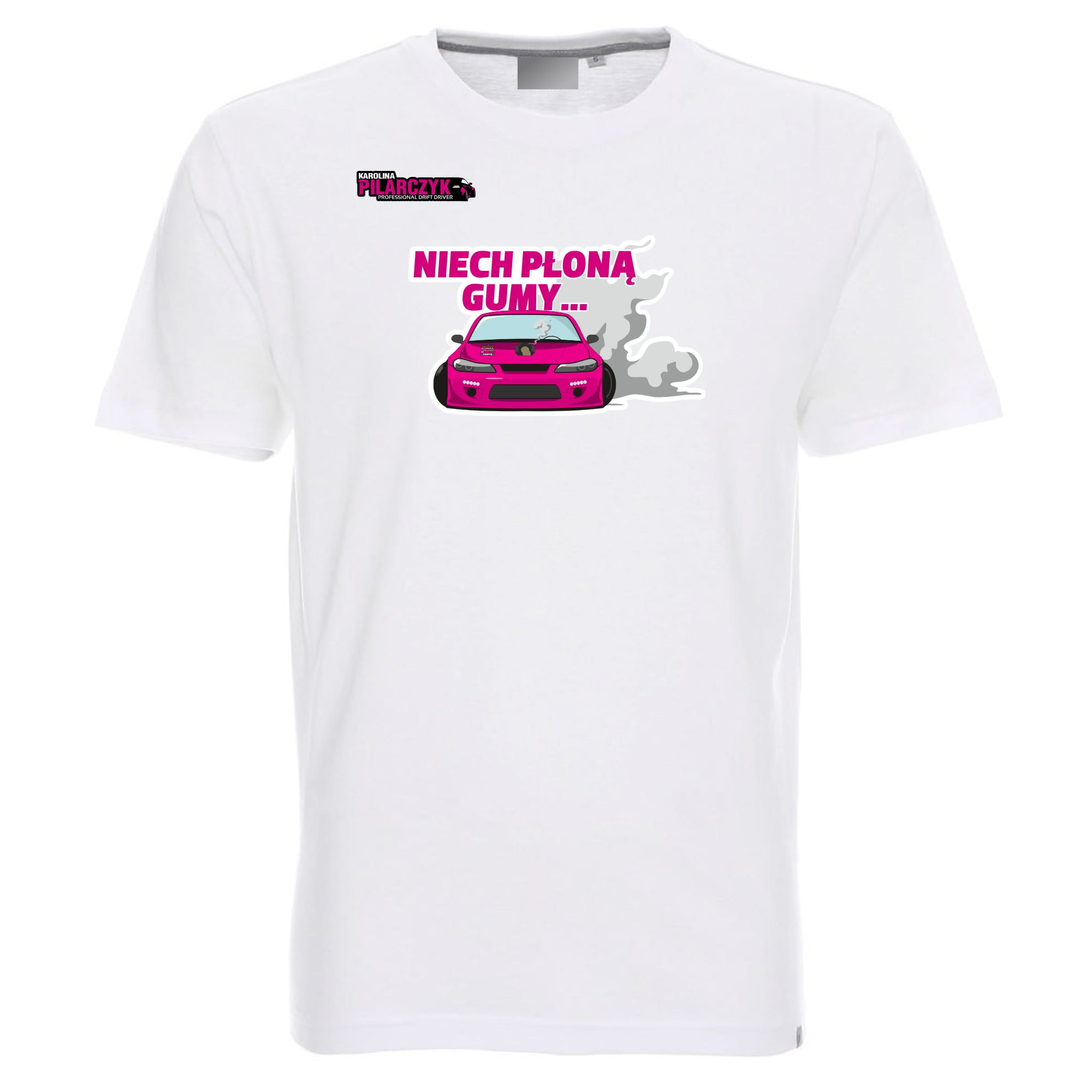Z przodu koszulki widnieje nadruk mistrzyni driftingu - Karoliny Pilarczyk, który dodaje jej charakteru i unikalności.